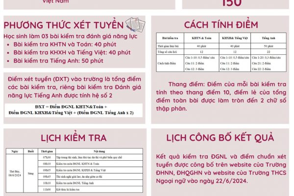 Quý Phụ huynh và học sinh thân mến! Trường THCS Ngoại ngữ xin gửi một số thông tin quan trọng trong công tác tuyển sinh vào lớp 6 năm học 2024 – 2025. Mọi thắc mắc xin vui lòng liên hệ dưới các hình thức