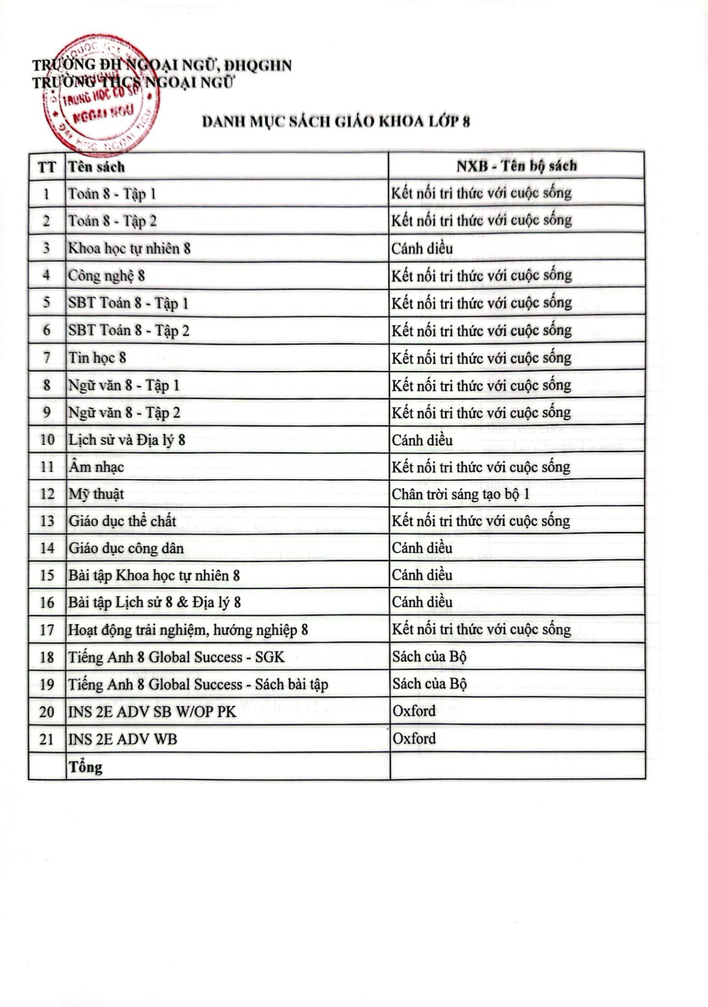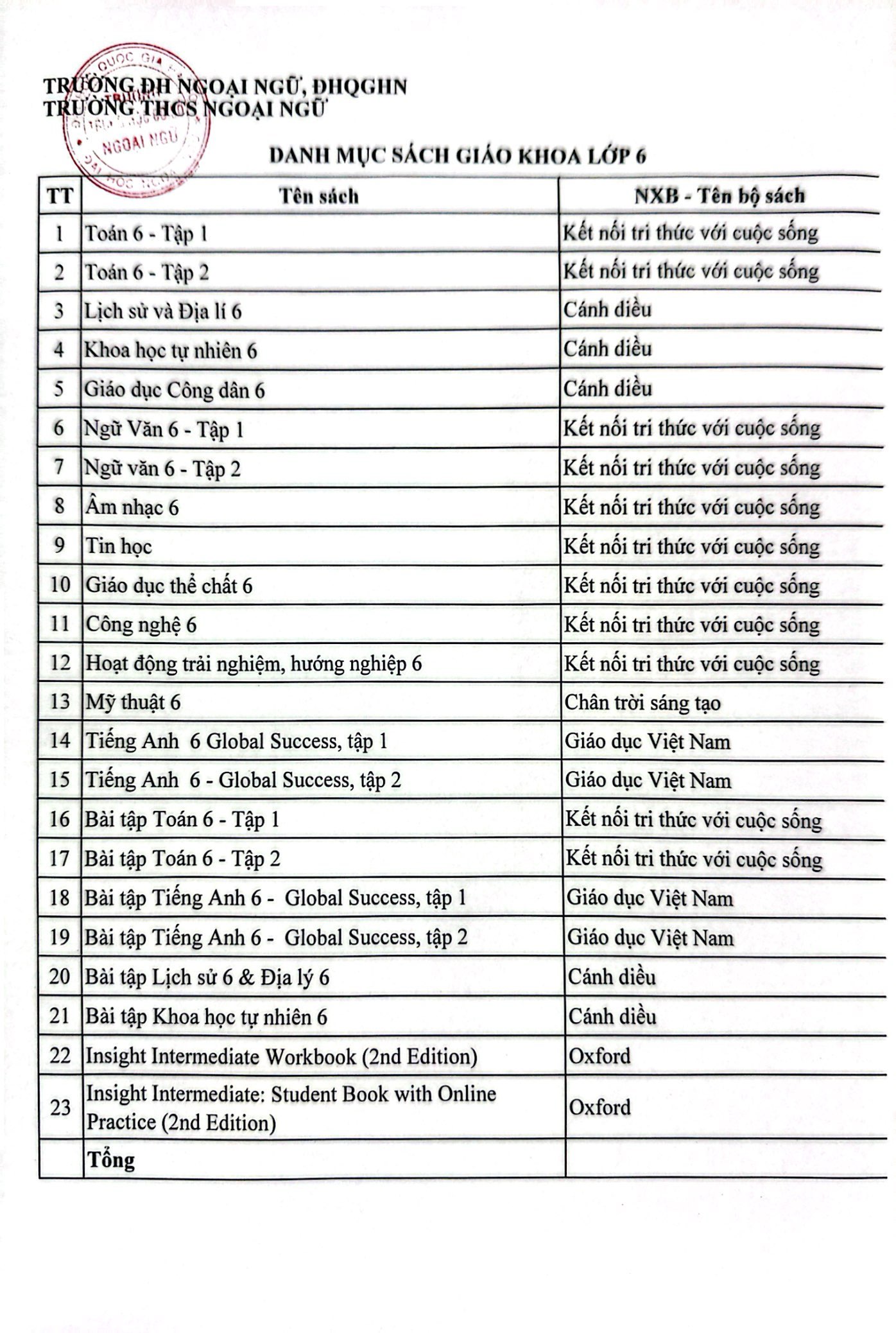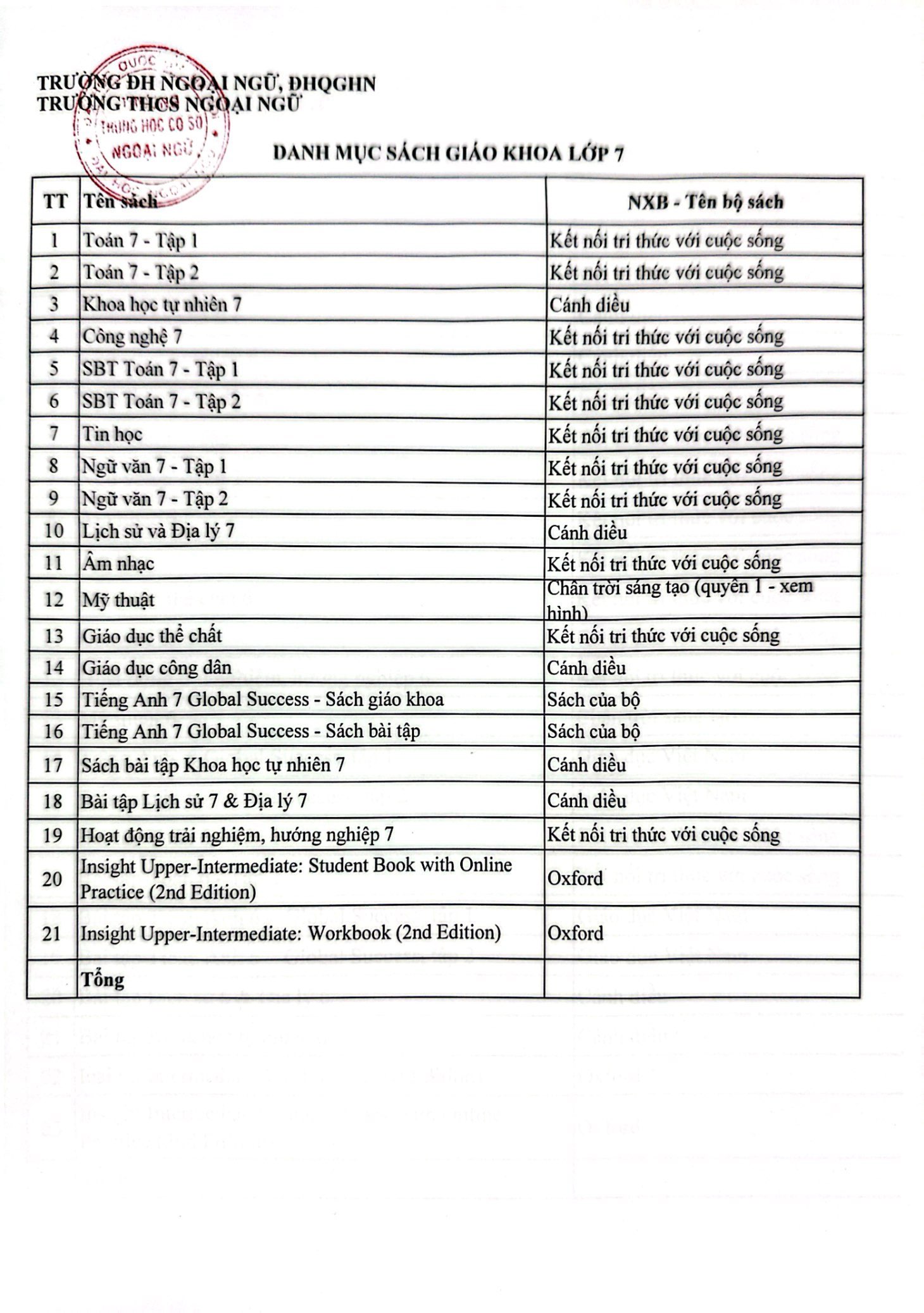 Nhà trường xin thông báo danh mục sách giáo khoa chính thức được sử dụng trong năm học 2025 – 2026. Đây là những cuốn sách được lựa chọn theo chương trình giáo dục hiện hành, đảm bảo phù hợp với mục tiêu dạy và học tại THCS Ngoại ngữ.