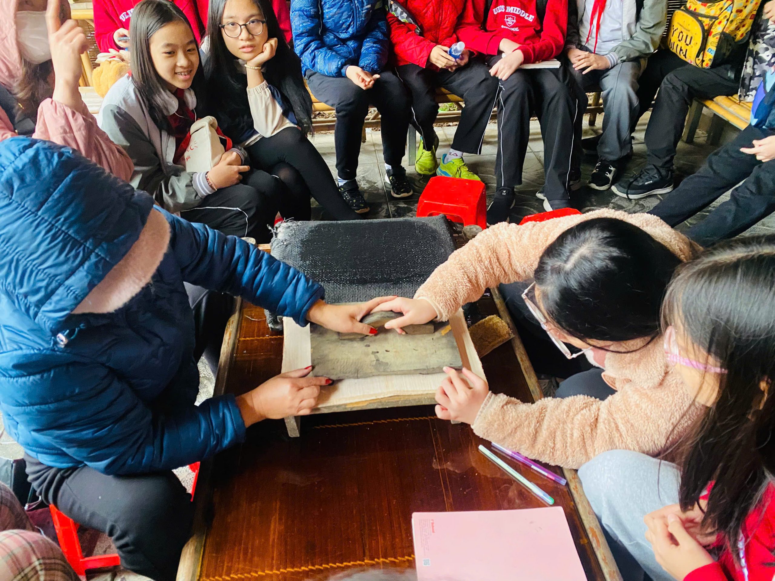 Các em được giới thiệu về quy trình tạo ván in, cách pha màu thảo mộc tự nhiên (thuốc cái), giấy điệp óng ánh và kỹ thuật in tranh truyền thống. Không chỉ dừng lại ở việc quan sát, học sinh còn trực tiếp thực hành in tranh Đông Hồ – tự tay tạo nên sản phẩm mang đậm dấu ấn văn hóa dân gian.