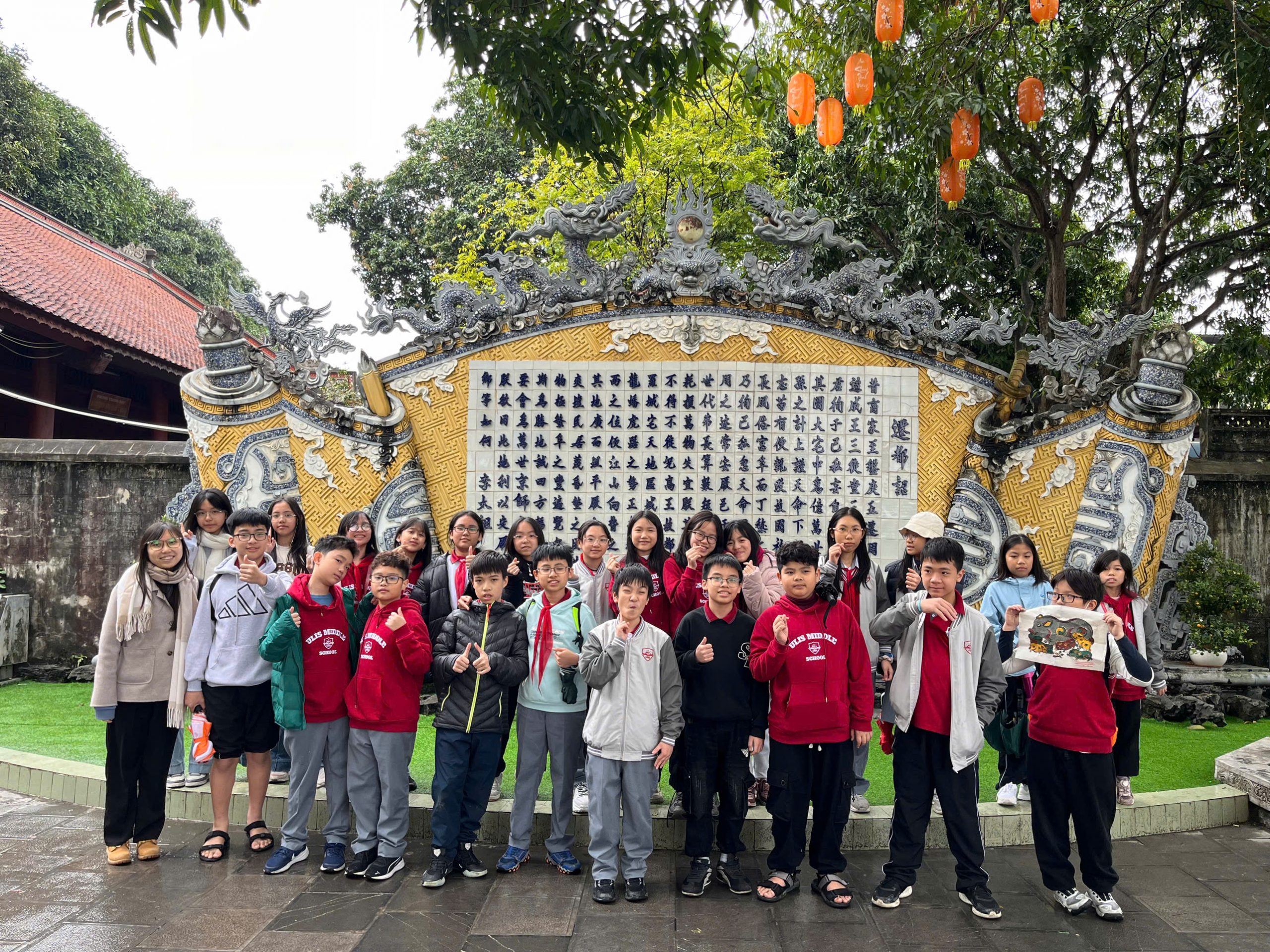 Các em tham quan khu di tích rộng hơn 31.000m² với 21 hạng mục công trình, gồm khu nội thành (Cổ Pháp điện, nhà Tiền tế, Hậu cung, nhà Mộ bia, Tả vu, Hữu vu) và khu ngoại thành (hồ Bán Nguyệt, Thủy đình, Văn Chỉ, Võ Chỉ). Không gian cổ kính, trang nghiêm giúp học sinh cảm nhận rõ hơn giá trị lịch sử và truyền thống tôn vinh tiền nhân của dân tộc.