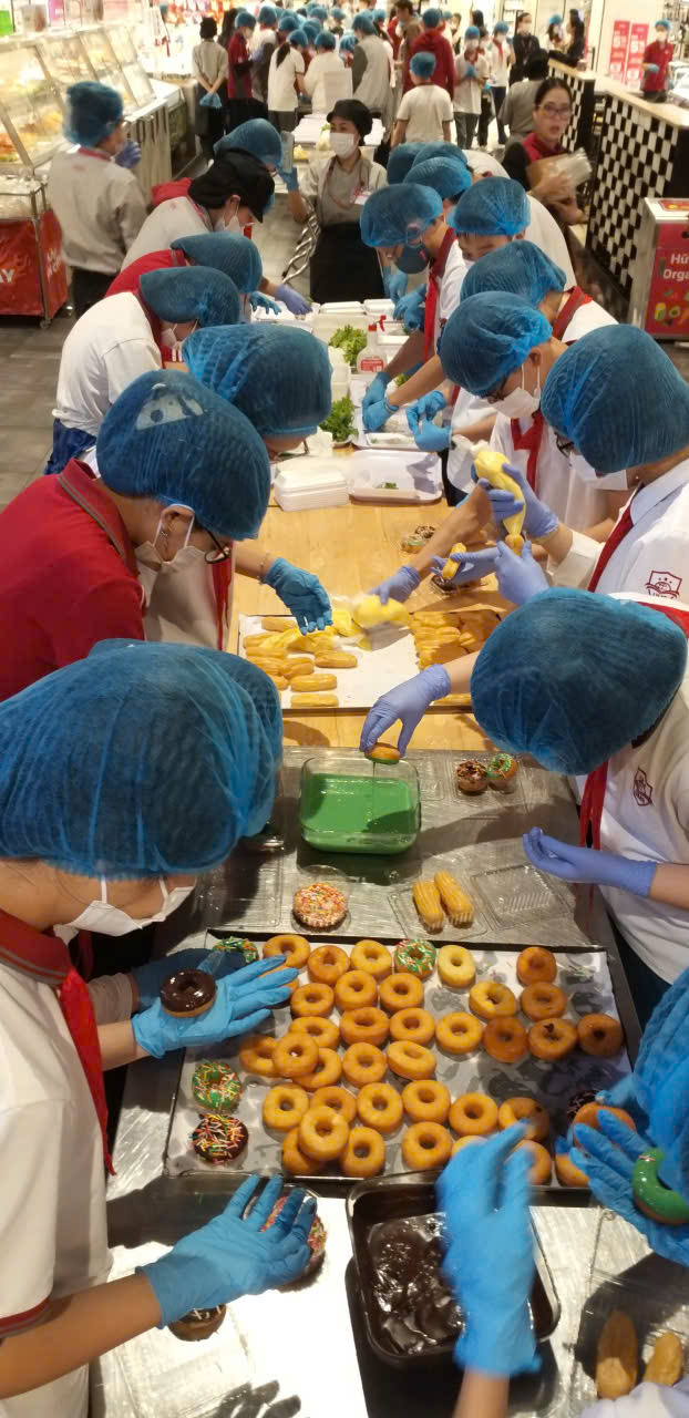 Ở khu vực thực hành, cả nhóm hào hứng thử sức với những món nhỏ xinh nhưng đòi hỏi sự khéo léo: Donut mini, sukem và gỏi cuốn.