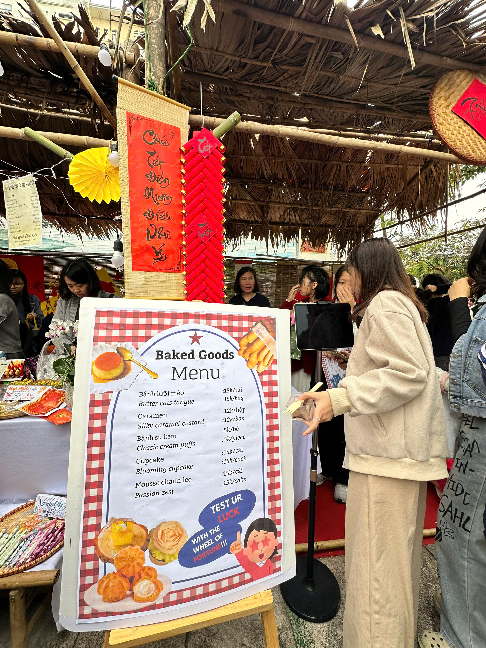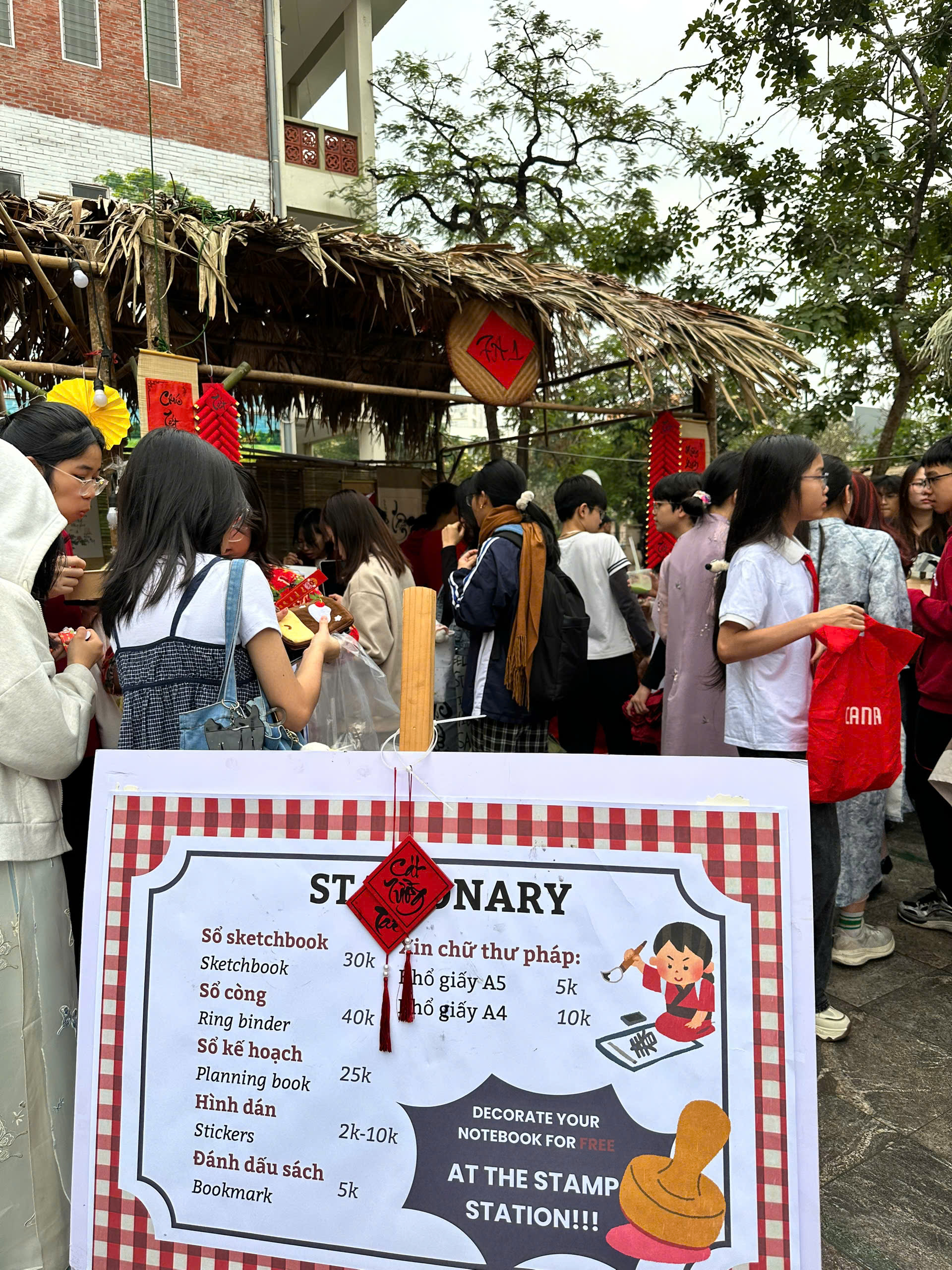 Trong khuôn khổ hội xuân, các lớp của nhà trường đã đăng ký và tổ chức nhiều gian hàng bán đồ ăn, đồ uống và các sản phẩm sáng tạo do chính học sinh chuẩn bị. Không gian gian hàng trở nên rực rỡ với những tấm biển trang trí mang đậm sắc xuân, thu hút đông đảo thầy cô, sinh viên và khách tham quan ghé thăm.
