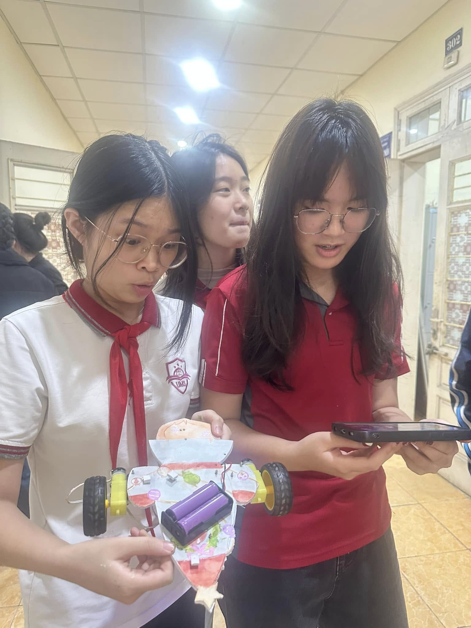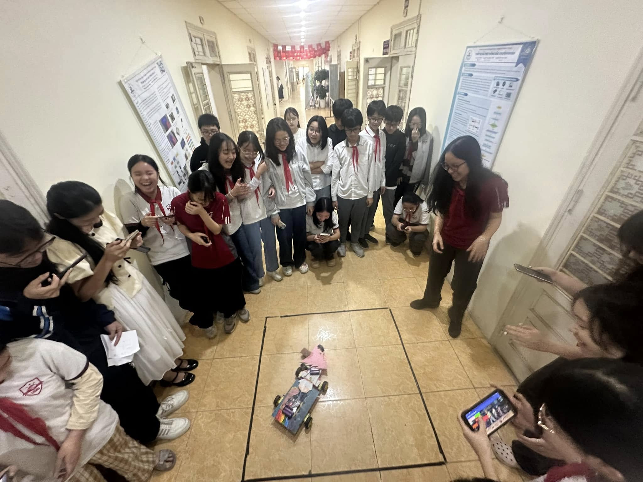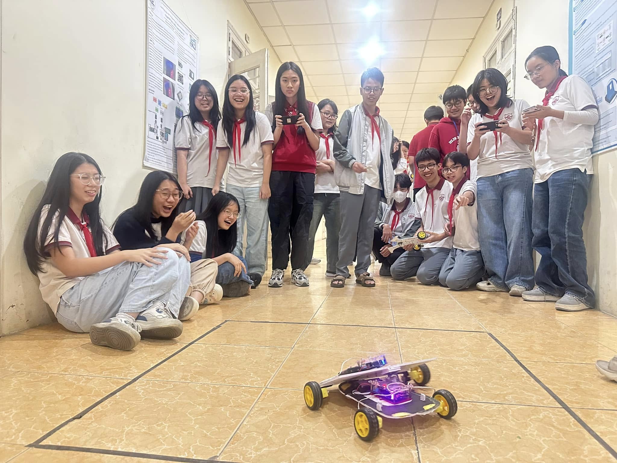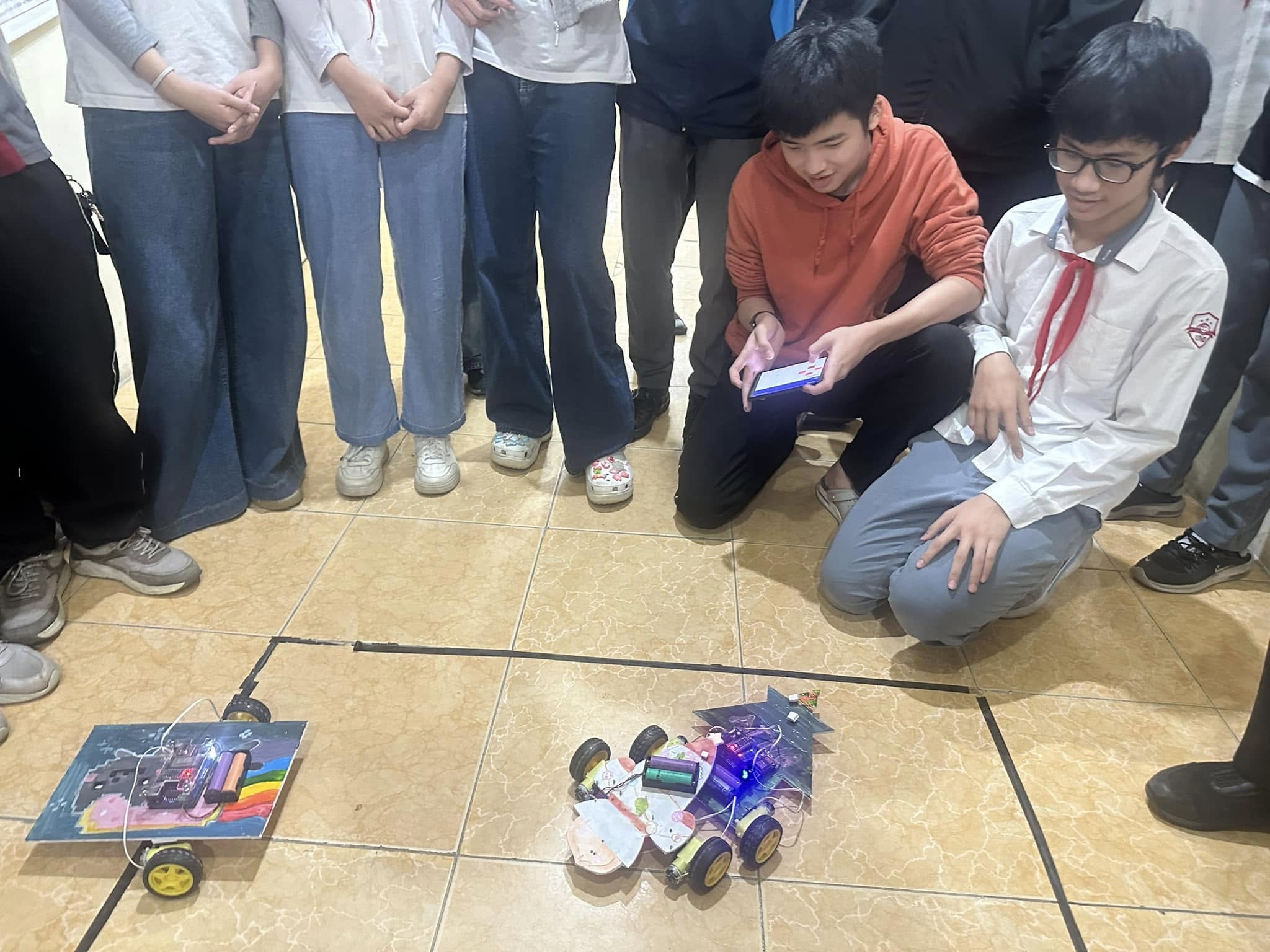 Khoảnh khắc robot lăn bánh theo lệnh khiến cả nhóm vô cùng thích thú. Mỗi lần thử – sai giúp các em hiểu rõ hơn cách mã lệnh vận hành và cách phần mềm điều khiển phần cứng.