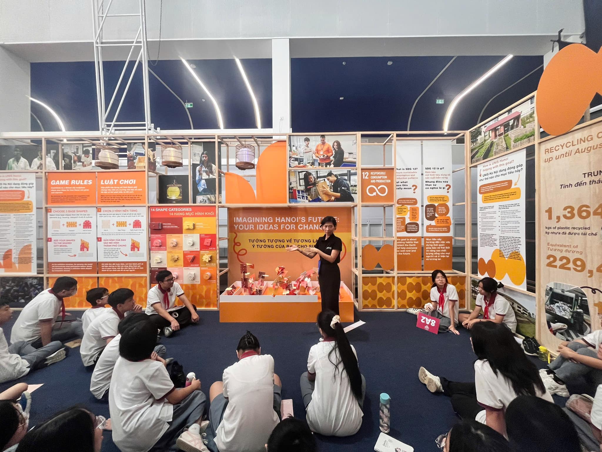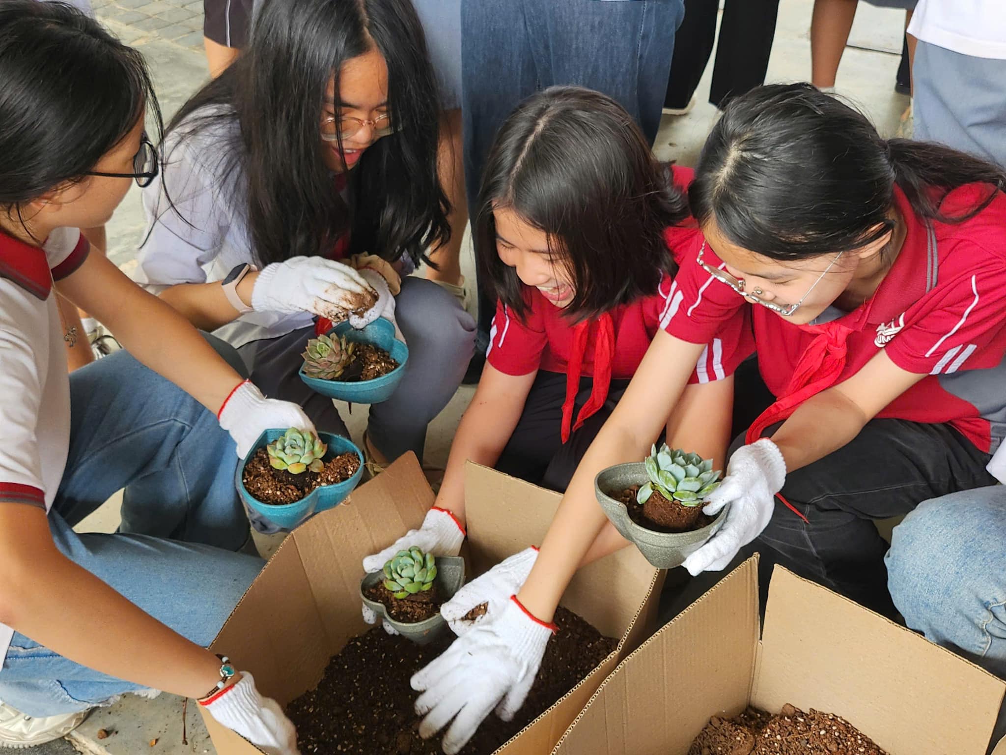 Buổi sáng hôm nay các em tham gia trải nghiệm tại các gian hàng xanh, tự tay trồng cây trong chậu nhựa tái chế, vẽ tranh trên giấy tái chế và tham quan các sản phẩm thân thiện môi trường.